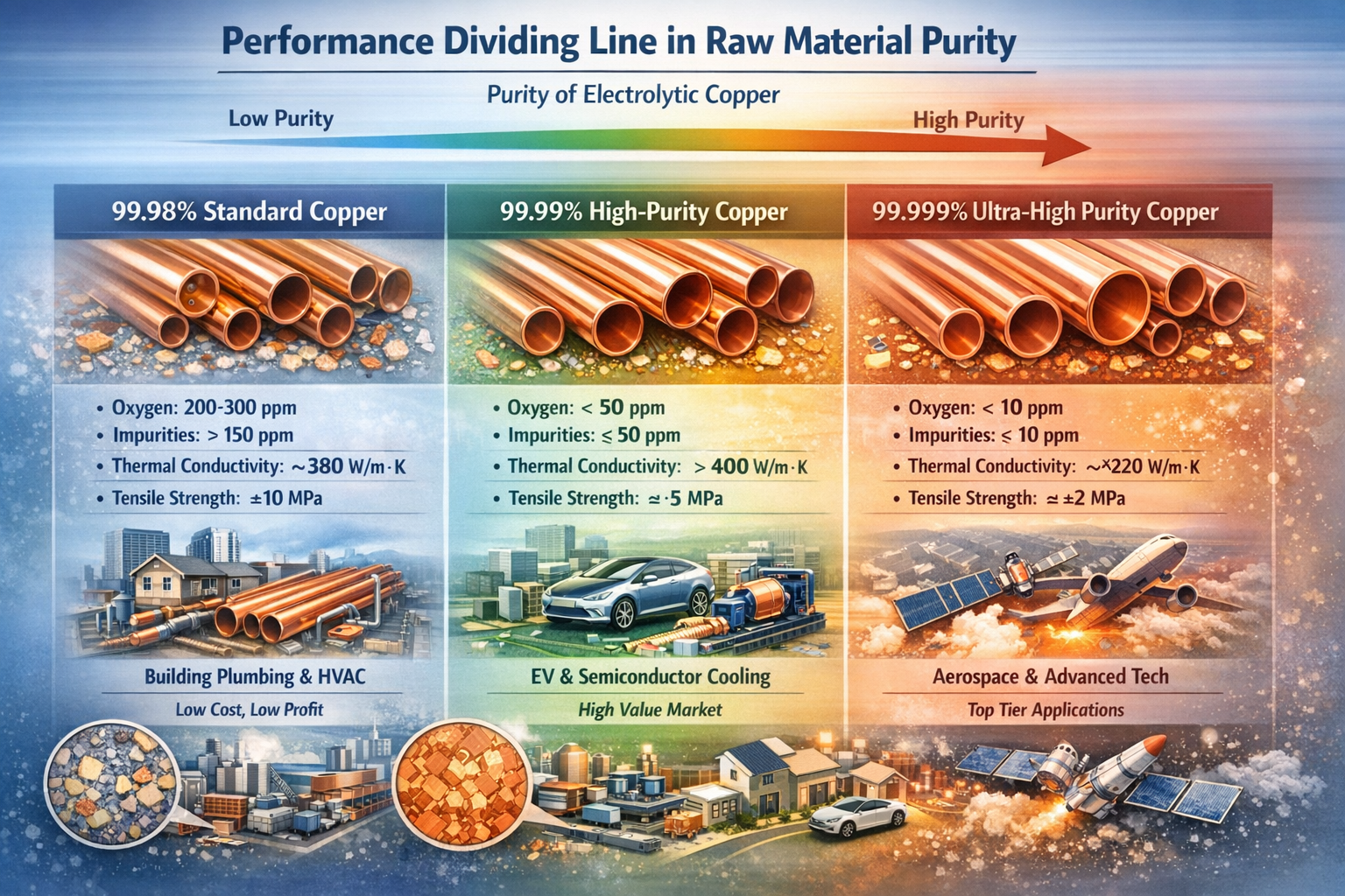 “Keduanya T2 tabung tembaga , tetapi produk yang kami produksi menggunakan 99,98% bahan baku tembaga elektrolitik murni sering kali menunjukkan pembuangan panas yang tidak merata dalam aplikasi pendinginan motor kendaraan energi baru; sementara produk pesaing kami, yang dibuat dengan 99,99% bahan mentah murni, secara konsisten mendapatkan pesanan jutaan dolar dari produsen otomotif.” Tuan Chen, direktur pembelian sebuah perusahaan tabung tembaga di Wuxi, mengungkapkan masalah tersembunyi dalam industri ini sambil memegang dua laporan pengujian bahan mentah. Kemurnian bahan baku, sebagai titik awal produksi tabung tembaga, tampaknya hanya selisih beberapa angka desimal, namun secara langsung menentukan kinerja inti produk, seperti konduktivitas termal, konduktivitas listrik, dan ketangguhan, bahkan menjadi "lulus" bagi perusahaan untuk memasuki pasar kelas atas. Saat ini, sebagian besar produsen tabung tembaga dalam negeri, untuk mengendalikan biaya, menggunakan bahan baku dengan kemurnian biasa, hanya memenuhi kebutuhan aplikasi konvensional; Namun, beberapa produsen kelas atas menerapkan kontrol ekstrem terhadap kemurnian bahan mentah, bahkan secara tepat mengendalikan komponen pengotor jejak, sehingga menguasai rantai pasokan kelas atas dengan keunggulan hulu ini. Perbedaan kemurnian sebesar 0,01% ini tidak hanya membedakan tingkat produk namun juga memegang kunci transformasi industri tabung tembaga dari "memenuhi syarat" menjadi "kelas atas".