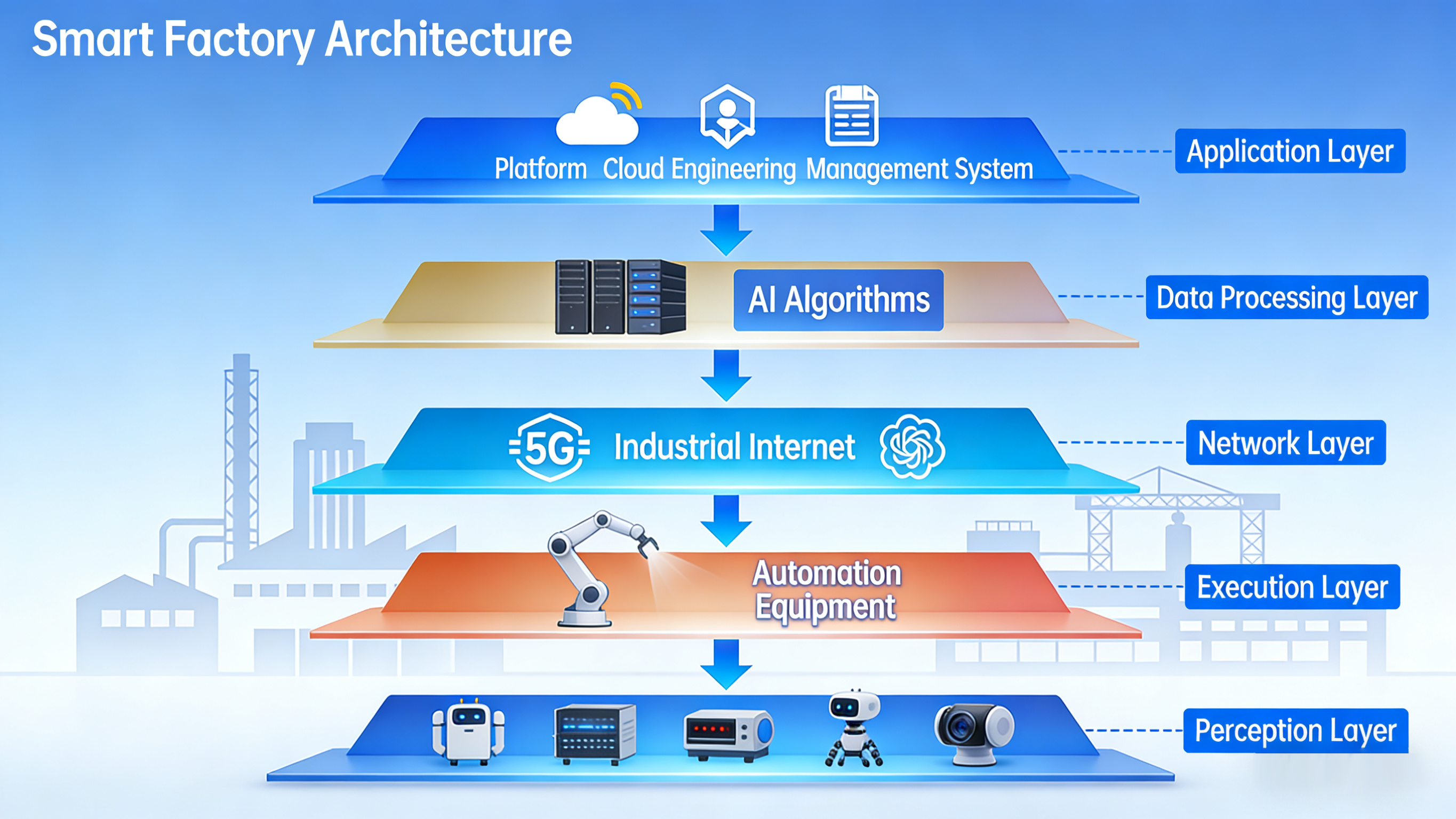 Gambar: Arsitektur pabrik pintar biasanya mencakup lapisan persepsi, jaringan, pemrosesan data, eksekusi, dan aplikasi, yang memungkinkan aliran data dari sensor ke platform cloud.