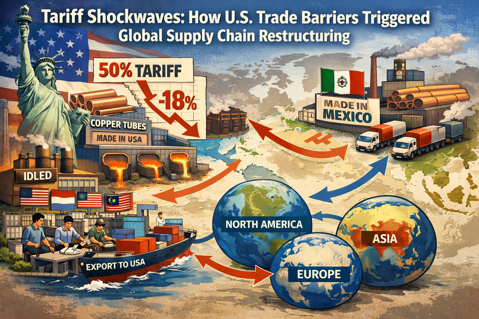 Subjudul: Ketika AS mengenakan tarif 50% pada tabung tembaga yang memicu restrukturisasi rantai perdagangan global, bagaimana kapasitas produksi di Asia Tenggara dan Meksiko melonjak sebesar 46,3% dalam setahun? Migrasi rantai pasokan yang didorong oleh kebijakan ini mengubah peta distribusi nilai global untuk pipa tembaga.