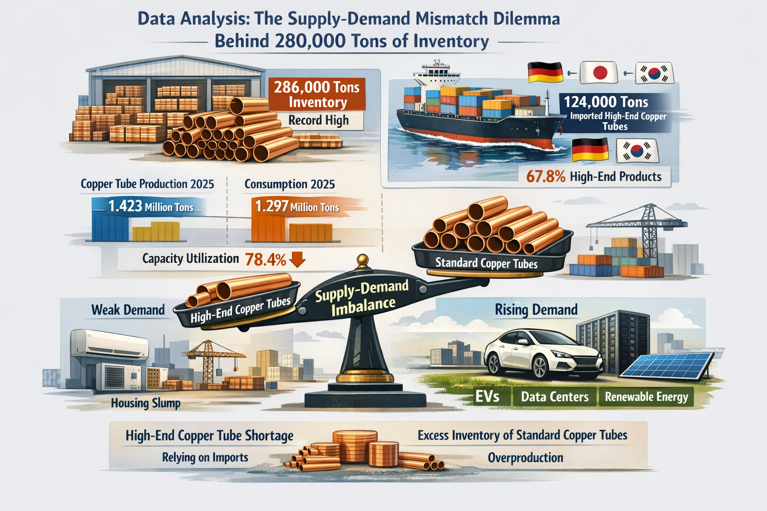 Data terbaru dari Biro Statistik Nasional dan Asosiasi Didustri Logam Nonferrous Tiongkok memberikan gambaran ketidakseimbangan dalam industri tabung tembaga Tiongkok. Pada tahun 2025, produksi tabung tembaga nasional mencapai 1,423 juta ton, meningkat sebesar 6,8% dari tahun ke tahun, namun konsumsi nyata pada periode yang sama hanya 1,297 juta ton, dan tingkat pemanfaatan kapasitas menurun menjadi 78,4%, turun sebesar 4,2 poin persentase dibdaningkan tahun 2024. Pada akhir Maret 2025, persediaan tabung tembaga dari perusahaan pengolahan tembaga besar di Tiongkok mencapai 286,000 ton, yang merupakan angka tertinggi baru dalam hampir lima tahun terakhir, dengan persediaan di Tiongkok Timur mencapai 52.3%, menyoroti peningkatan produksi yang sangat menonjol. ketidaksesuaian pasokan dan permintaan regional .