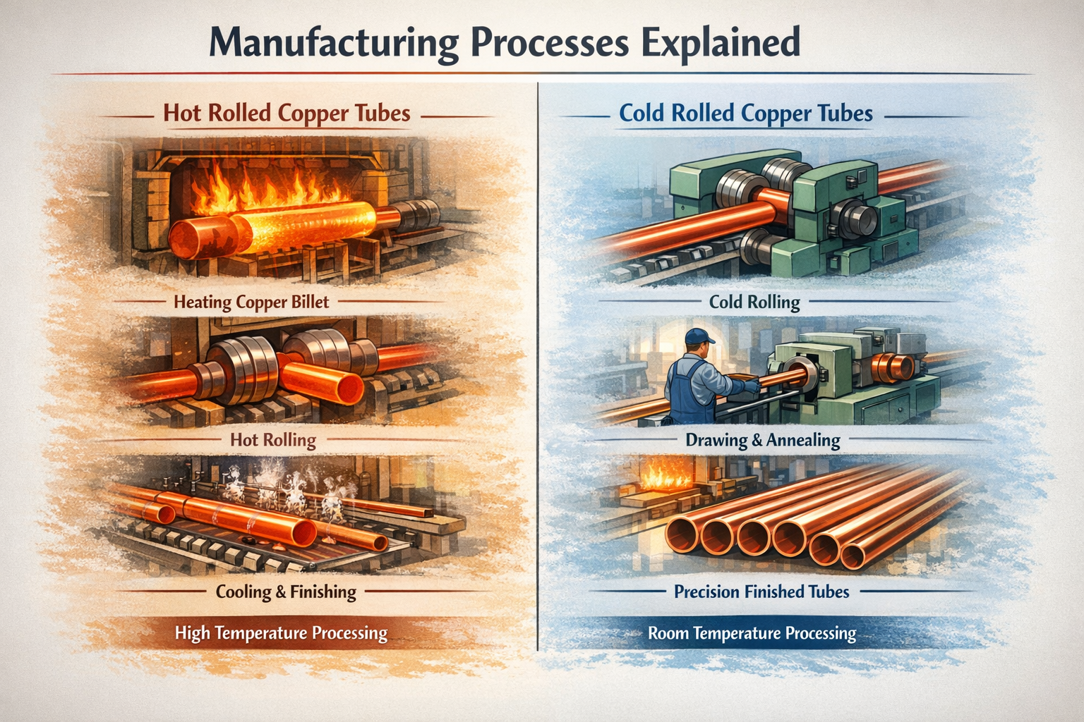 Proses manufaktur adalah dasar dari perbedaan kinerja antara tabung tembaga canai dingin dan canai panas. Seorang yang berkualitas pabrik tabung tembaga biasanya menawarkan kedua opsi untuk melayani permintaan pasar yang beragam.