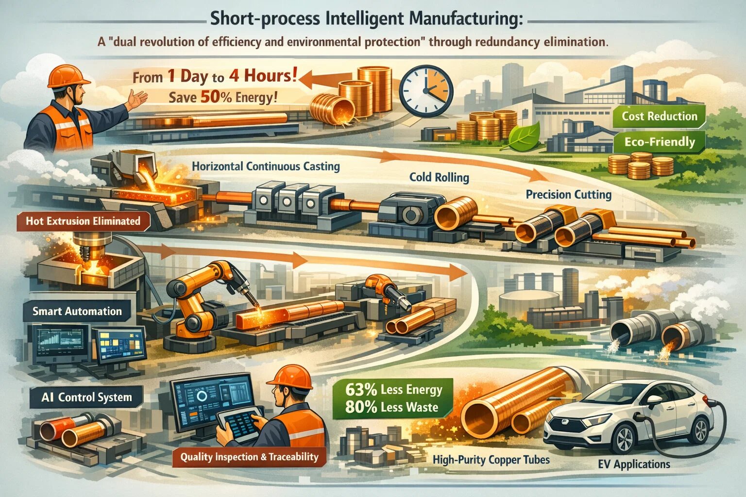 Terobosan inti terletak pada “penyederhanaan proses” dan “pemberdayaan cerdas.” Langkah tradisional "ekstrusi panas" dihilangkan secara langsung, dan teknologi pengecoran berbantuan ultrasonik digunakan untuk mengoptimalkan struktur kristal tabung kosong, mengurangi segregasi logam dan menghasilkan kekasaran permukaan bagian dalam ≤0,8μm, memungkinkannya melanjutkan langsung ke proses penggulungan dingin tanpa pemolesan selanjutnya. Di lini produksi proses pendek "tiga tungku keadaan panas" Southwest Copper, konfigurasi terintegrasi dari "peleburan samping yang diperkaya oksigen, multi-tombak, pemurnian terus menerus, pemurnian tungku anoda putar" mencapai produksi berkelanjutan dari konsentrat tembaga hingga tembaga anoda, dengan kapasitas pemrosesan tahunan sebesar 1,6 juta ton. Hal ini mengurangi tiga langkah transfer dibandingkan dengan proses tradisional dan mengurangi jejak peralatan sebesar 40%.