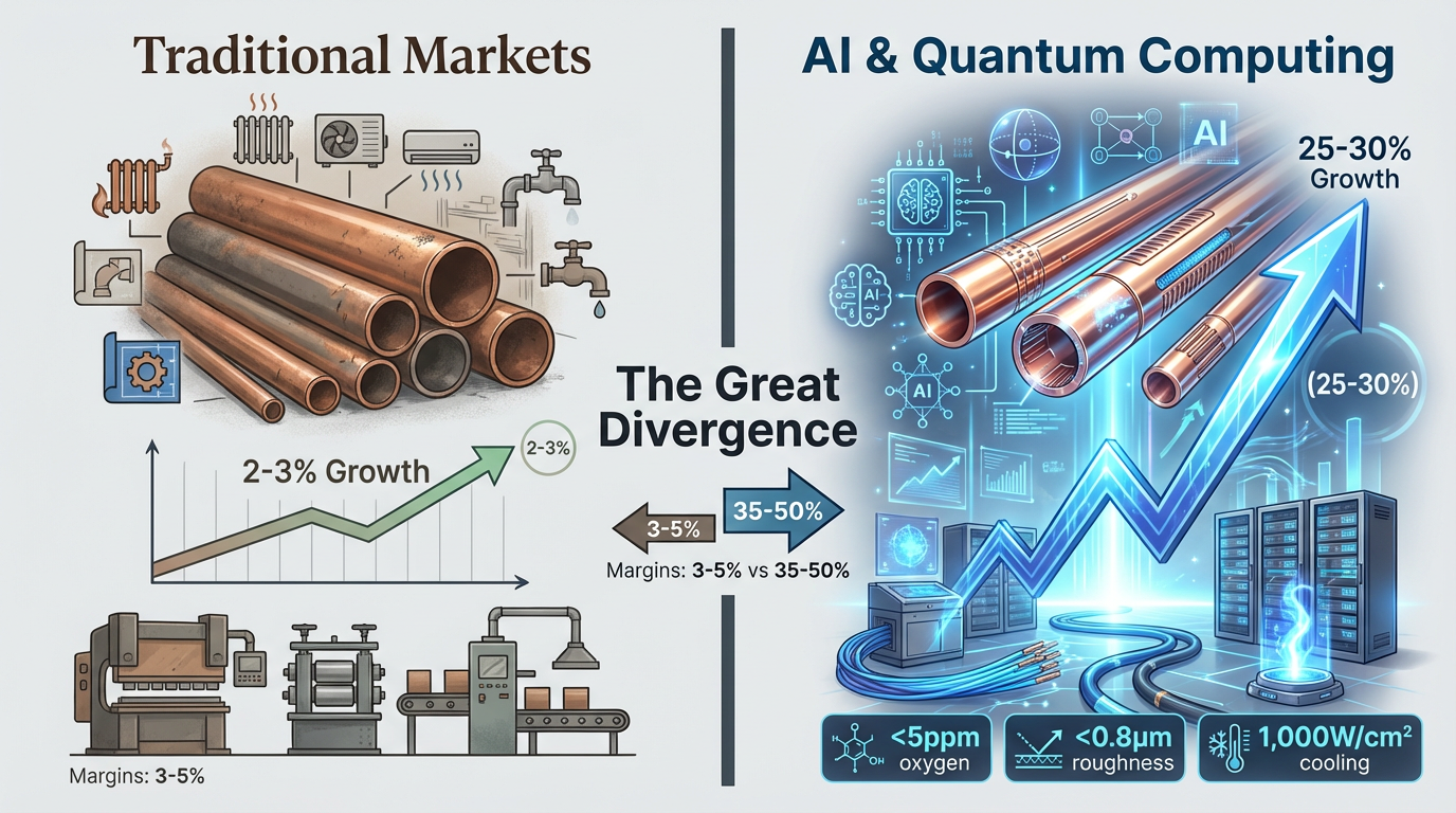global tabung tembaga industri mengalami fragmentasi yang belum pernah terjadi sebelumnya. Sementara konstruksi tradisional and Aplikasi HVAC tumbuh sebesar 2-3% per tahun, permintaan untuk tabung presisi di bidang manufaktur semikonduktor, infrastruktur AI, dan komputasi kuantum melonjak sebesar 25-30% setiap tahun. Perbedaan ini menciptakan pasar dua tingkat: produsen massal berjuang dengan margin 3-5%, sementara produsen khusus mendapatkan margin kotor 35-50% untuk tabung yang memenuhi spesifikasi ekstrem.